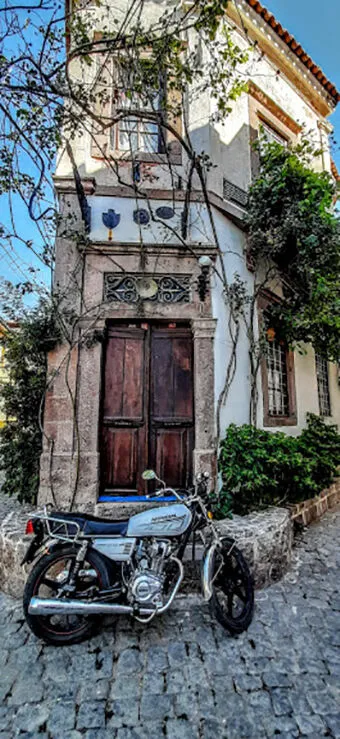 Tarihi Ayvalık evlerinin ana malzemesini sarımsaklı taşları oluşturuyor. Bu taşlar antik çağlardan beri kullanılıyor. 18. ve 19. yüzyıl Türk ve Rum toplum yaşantısını yansıtan önemli mimarlık örneklerinden olan tarihi Ayvalık evlerinin estetik görünümünü bütünleyen sarımsak taşı, bu evlerin en önemli özelliği olarak biliniyor. Kapıların fotoğraflarını çekerken tarihlere de göz atıyorum. 200 yıla merdiven dayamış binalar. 1881 tarihli binanın önünde duruyorum, Atatürk’ün doğduğu tarihte bu Rum evinde yaşam başlamış. Bakımlı evler sanki pek havalı süzülüyor gibi geliyor insana. Gerçekten taşın özelliklerinden kaynaklanıyor olmalı, binalar dimdik ayakta, bakımları yapılmış olanlardan ise insan gözlerini alamıyor. Tescilli yapılar genel olarak sahipleri tarafından restore edilmiş, bakımları yapılmış, bahçeleri rengarenk çiçeklerle bezenmiş. Gülkurusu renginde olan bu taşlar, çok kolay işlendiği ve dayanıklılığı nedeniyle o dönem tercih edilmiş. Sarımsak taşının ana kaynağı ise Sarımsaklı bölgesi. Binlerce yıl öncesinin lav akıntılarının oluşturduğu sarımsak taşı, bugün Ayvalık ve Cunda’nın evlerinde şekil bulmuş. Dokusu sarımsak damarlarına benzediği, içindeki demirin okside olmasıyla giderek kırmızılaşması nedeniyle ‘sarımsak’ adı verilen taşlar Ayvalık sokaklarını renklendiriyor. Kırmızı kiremitli çatılar eski yapılara ayrı bir güzellik katmış, bir de rengarenk kapı ve pencereleri, çocukların suluboya resim yaptıkları defterlerden çıkmış gibi duruyor insanın karşısında.